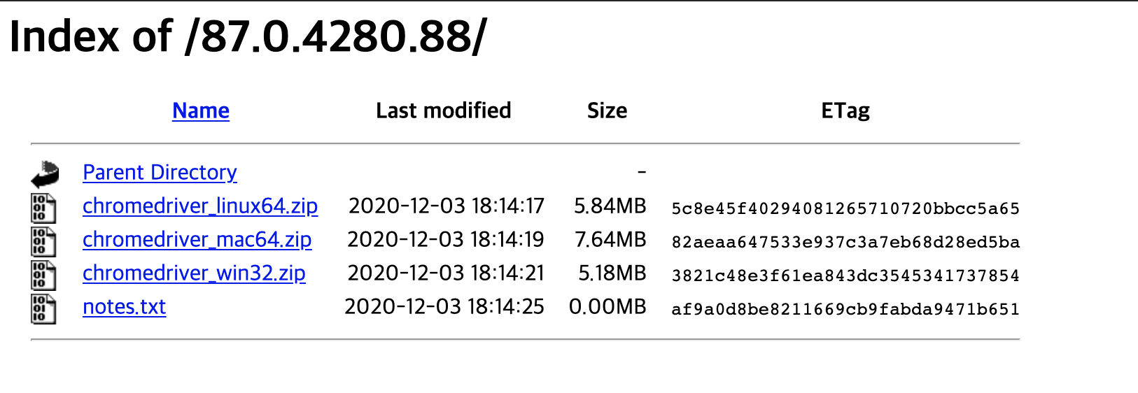 아래 링크를 통해 자신의 chrome버전과 같은 chromedriver를 선택하고 내 os에 맞게 설치합니다.