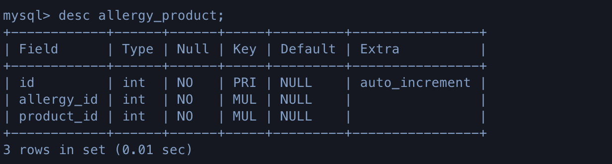: AllergyProduct 클래스로 생성된 테이블이자 through 옵션으로 product와 allergy의 중간 테이블로 지정해 준 테이블.
