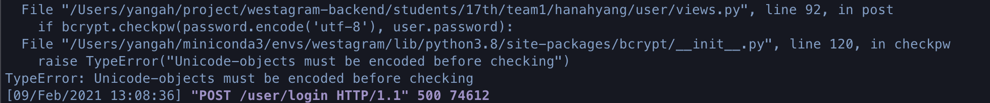 하지만 이렇게 설정하고 테스트한 결과 bcrypt.checkpw에서 문제가 발생함을 알 수 있었다.