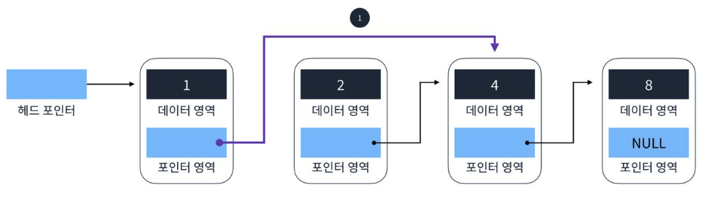 1. 삭제할 요소의 이전 요소(1)의 다음 포인터가 삭제할 요소의 다음 요소(4)를 가리키도록 한다.
