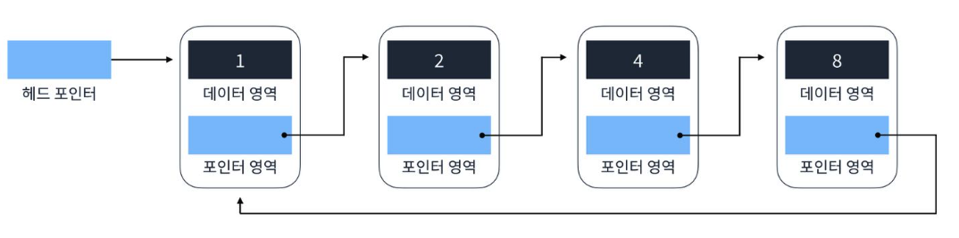 Tail의 포인터가 Head를 가리키도록 한 연결 리스트. 메모리를 아껴쓸 수 있다. 원형 큐 등을 만들 때도 사용된다.