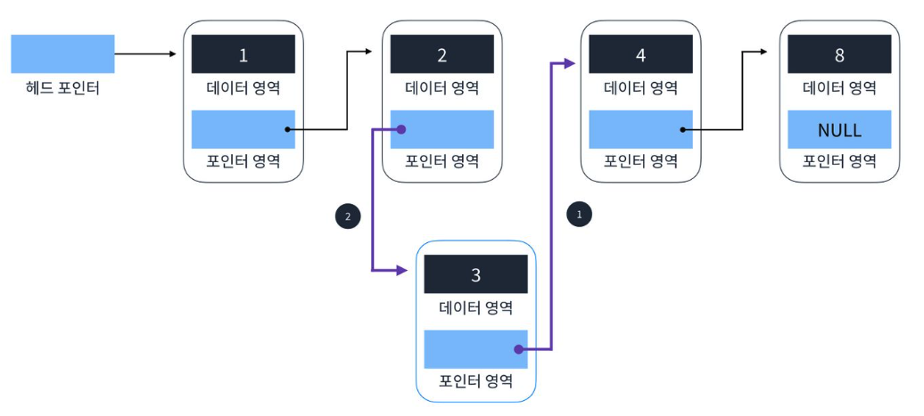 ex) 위 연결리스트에서 데이터 값이 2인 요소와 4인 요소 사이에 데이터 값이 3인 요소를 추가한다면?