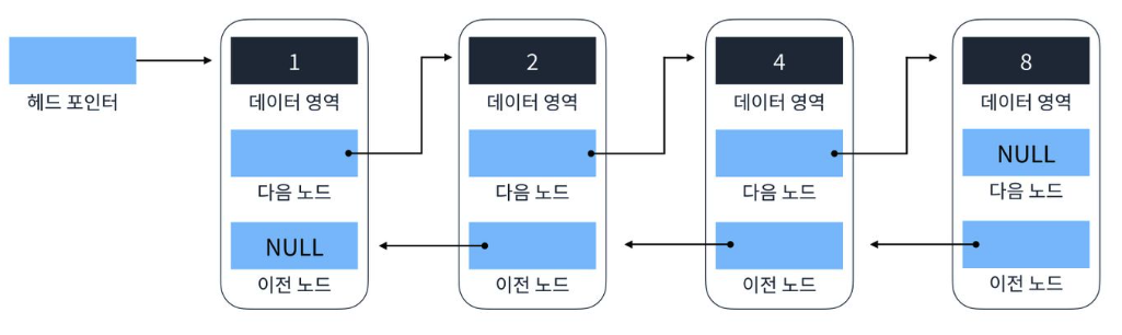 포인터가 두개 존재하여 다음과 이전을 가르킬 수 있어 양방향으로 이어지는 구조인 연결 리스트다.