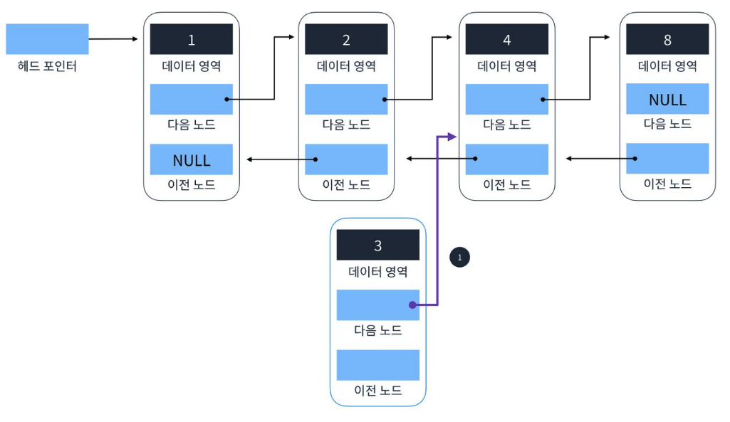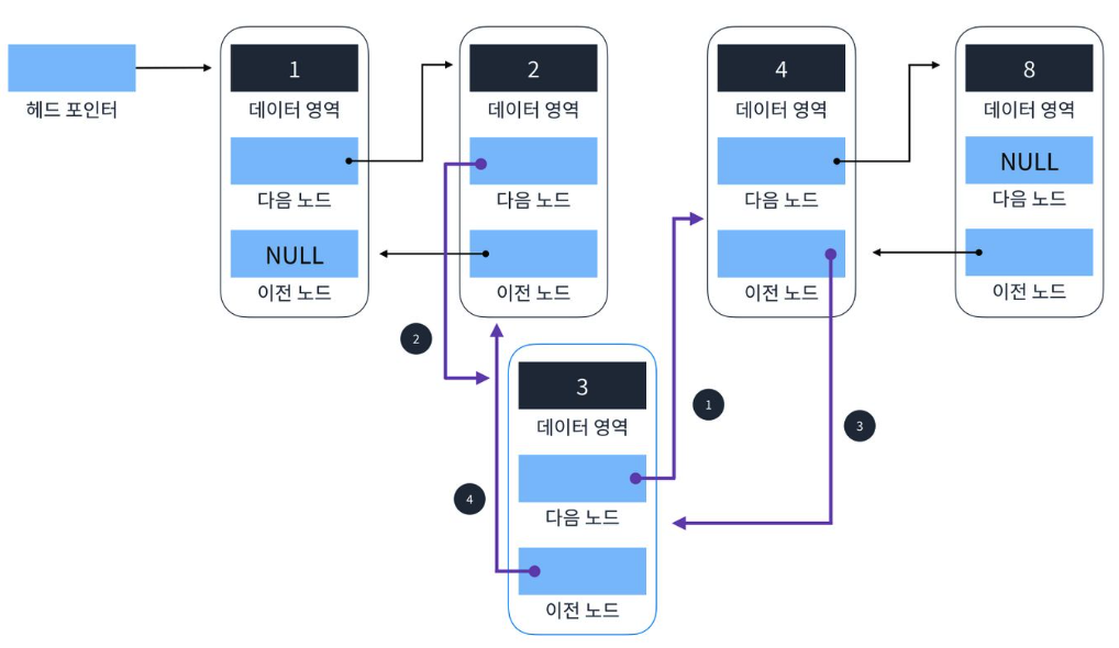 3. 추가할 요소의 다음 요소(4)의 이전 포인터가 추가할 요소를 가리키도록 한다.