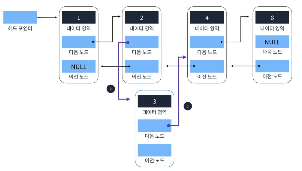 >> 단일 연결 리스트와 마찬가지로 요소 추가 로직에 O(1)시간이 소요된다.