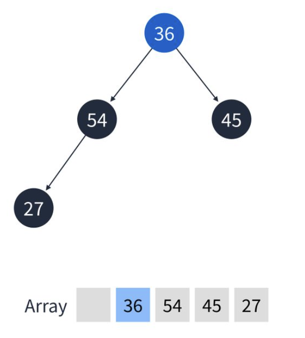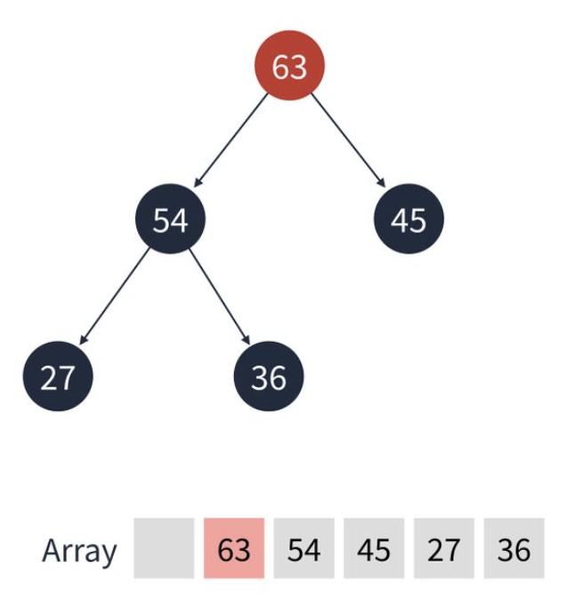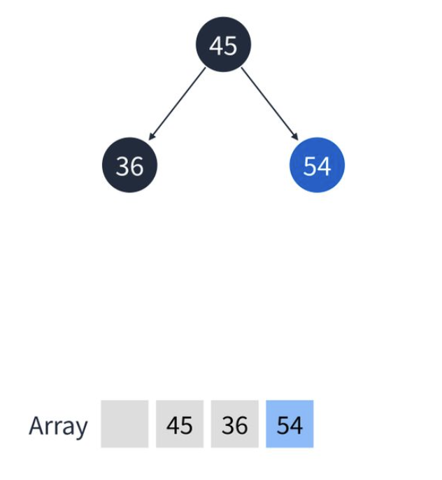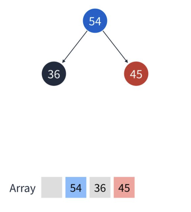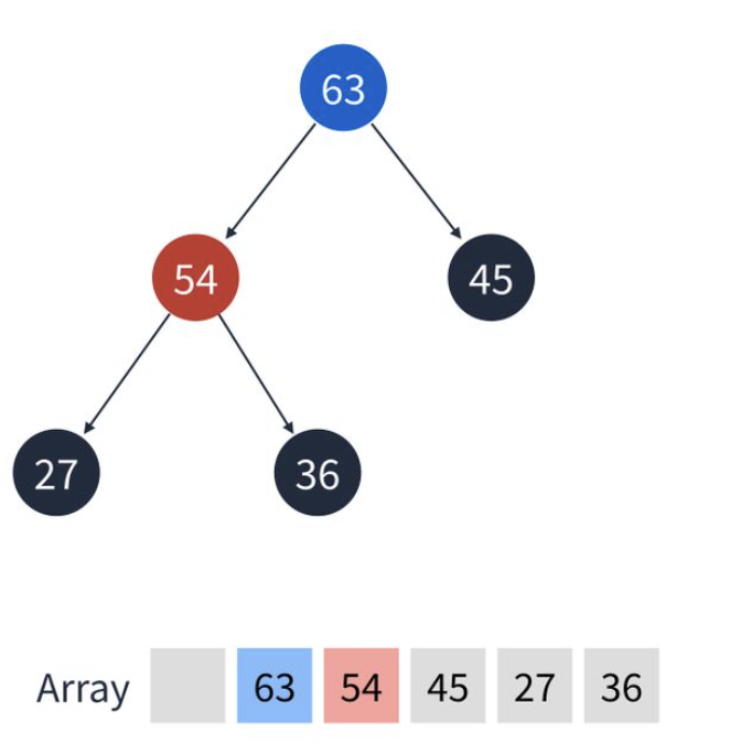 4. 최대 힙에서 45보다 54가 우선순위가 더 높기 때문에 서로 순서를 바꾼다. 마찬가지로 배열도 바뀐다.