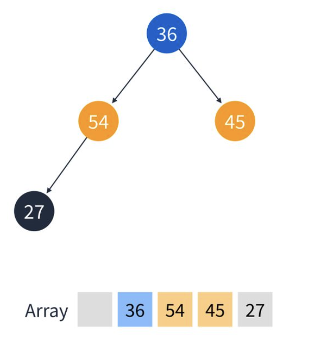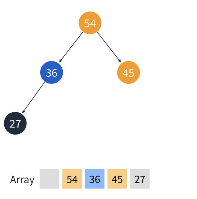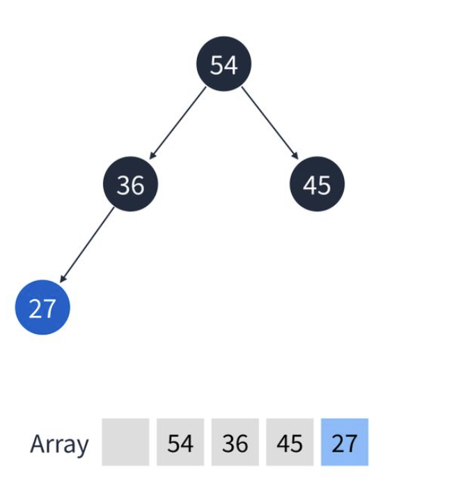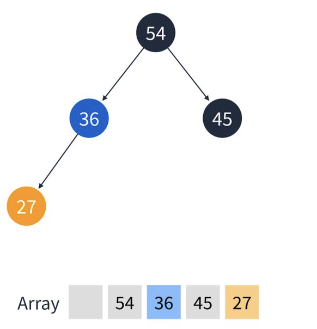 5. 이번엔 27을 추가. 마지막 위치인 36의 왼쪽 정점에 추가된다.