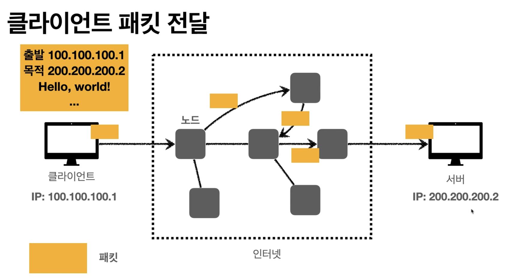 - 패킷(packet)이라는 통신 단위로 데이터 전달