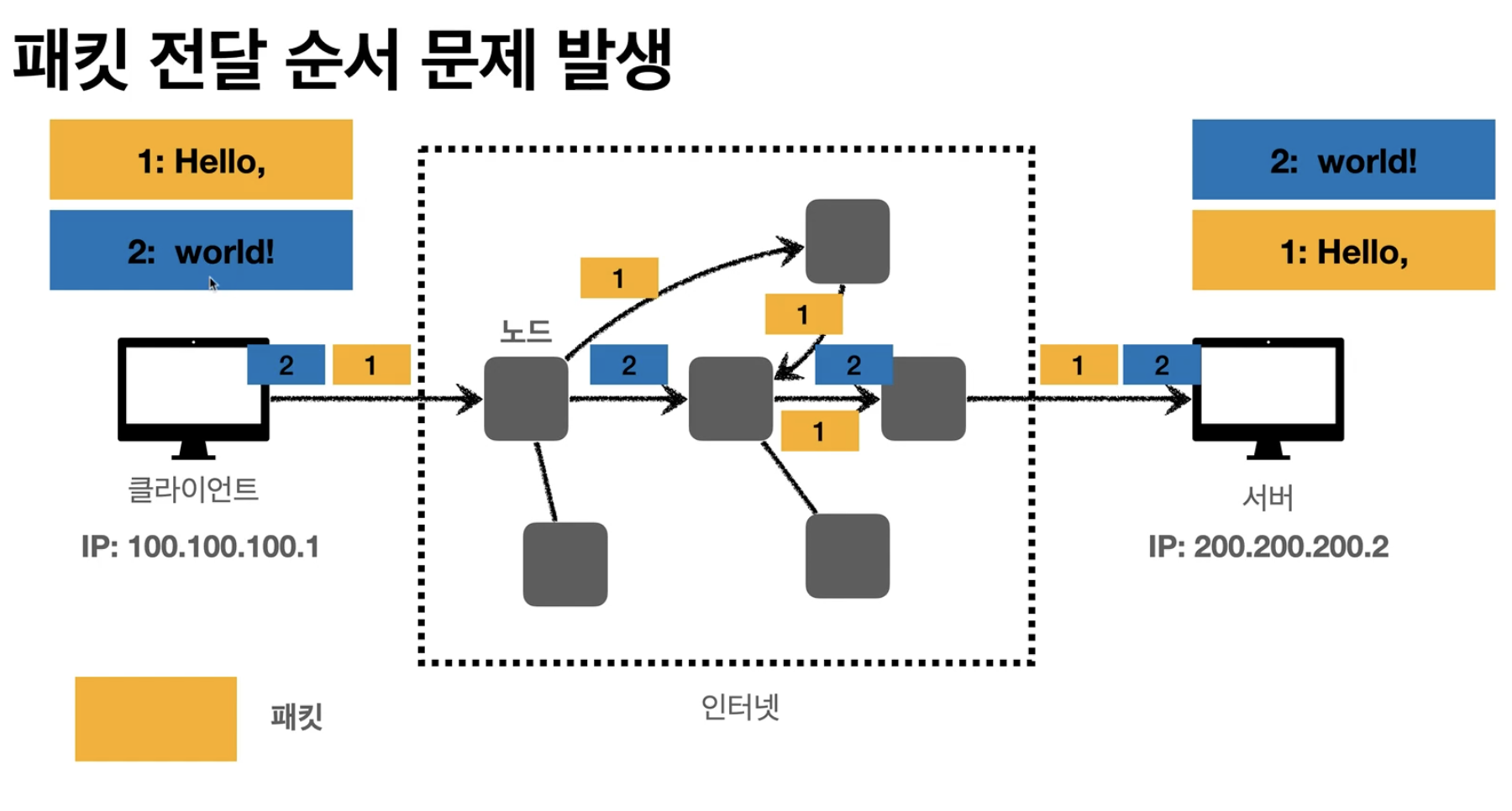 인터넷 망이라는게 결국은 여러 서버들을 거처서 전달을 한다는 건데, 중간에 한 서버에 문제가 있다면 패킷이 유실된다. 근데 이렇게 유실이 된다고해도 서버는 유신된줄도 모른다. - 패킷이 순서대로 안 올 수 있다.