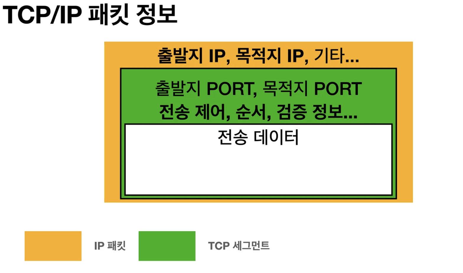 - OS계층에서는 TCP가 이 메세지에다가 TCP 정보를 붙인다(위 사진에서 초록색 부분이 TCP 정보이다). 이를 TCP 세그먼트라고 한다.