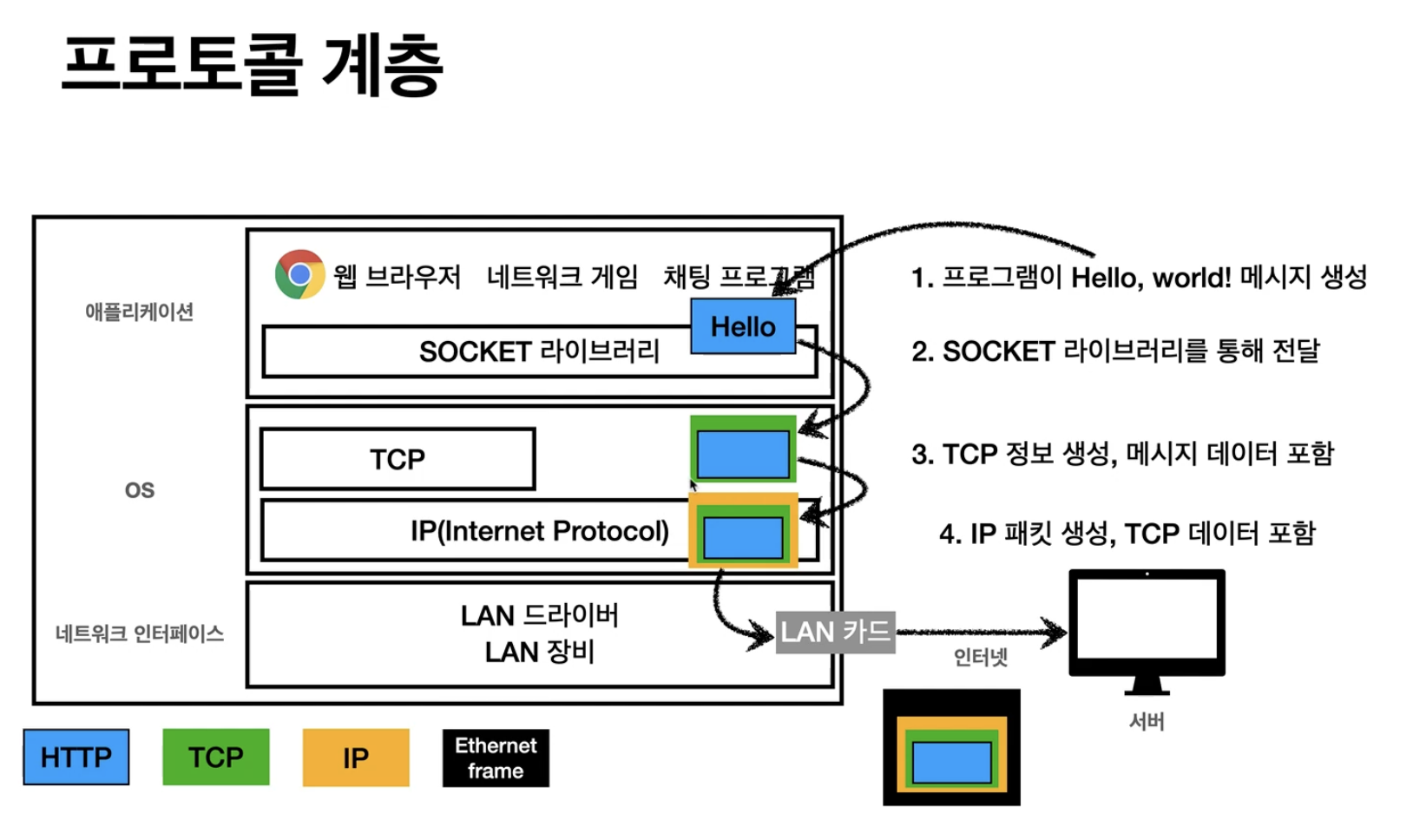 - 맨 먼저 채팅 프로그램은 소켓 라이브러리를 통해 OS 계층으로 'hello world'라는 메세지를 넘긴다.